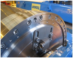 安德里茨離心機在耐磨損防護上的顯著特點是卸料螺旋葉片全程采用了可更換式的碳化鎢耐磨片。此耐磨片是噴涂碳化鎢結構,耐磨性能好。同時卸料螺旋磨損后只需更換耐磨片即可,極大地降低了維修費用。同時對進料的噴嘴和污泥排出口也采用了可更換式的斯泰利硬質合金或碳化鎢噴嘴。